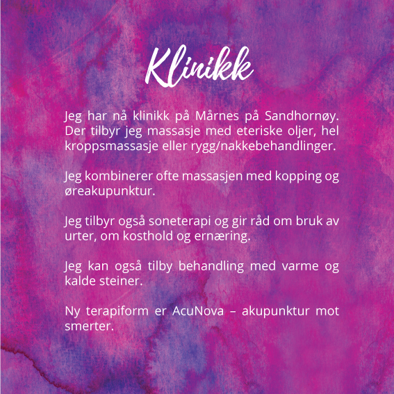 Mitt vitebegjær har vært nærmest umettelig, og antall skoler og kurs jeg har diplomer og eksamener fra, har etter hvert blitt temmelig mange. Jeg har deltatt på kurs og studiesamlinger i Norge, Sverige, Danmark, Tyskland, Spania, Skottland, Florida og Canada. Følgende hovedterapiformer er jeg godkjent i av NNH – Norske Naturterapeuters Hovedorganisasjon: Soneterapi, Fytoterapi, Kinesiologi, EBA akupunktur, Kopping massasje og Naturmedisinsk aromaterapi. I tillegg har jeg eksamen i Medisinsk baskunnskap (grunnmedisin). Eksamenen var i medisinske emner som tilsvarer den teoretiske utdannelsen til leger, et to- og et halvårig deltidsstudium med samlinger både ved Rikshospitalet i Oslo og Uppsala Biomedisinske Centrum. Etter å ha praktisert i mange år i min private klinikk – overtok jeg i år 2000 en liten skole som het Aromaterapiskolen Nord. Dette var starten på enda en ny oppgave i mitt liv. En oppgave som jeg har elsket av hele mitt hjerte. Jeg utviklet Aromaterapiskolen ganske raskt til å gi tilbud i mange flere fag, og det har vært samlinger i Bodø, Fauske, Tromsø, Sortland og på Saltfjellet – foruten her på Sandhornøya. Lærere har vært hentet inn fra hele landet, fra Sverige, Danmark og Tyskland. Vi har sammen hatt lærerike og minneverdige opplevelser. Mange er blitt venner for livet, og det er en stor glede for meg å få følge noen av dem videre.